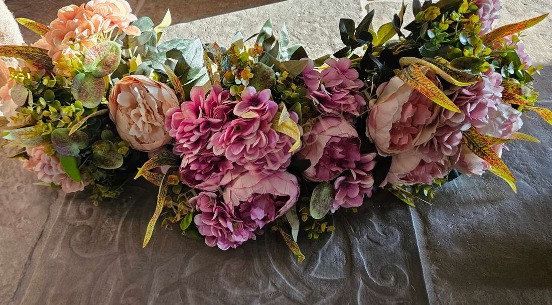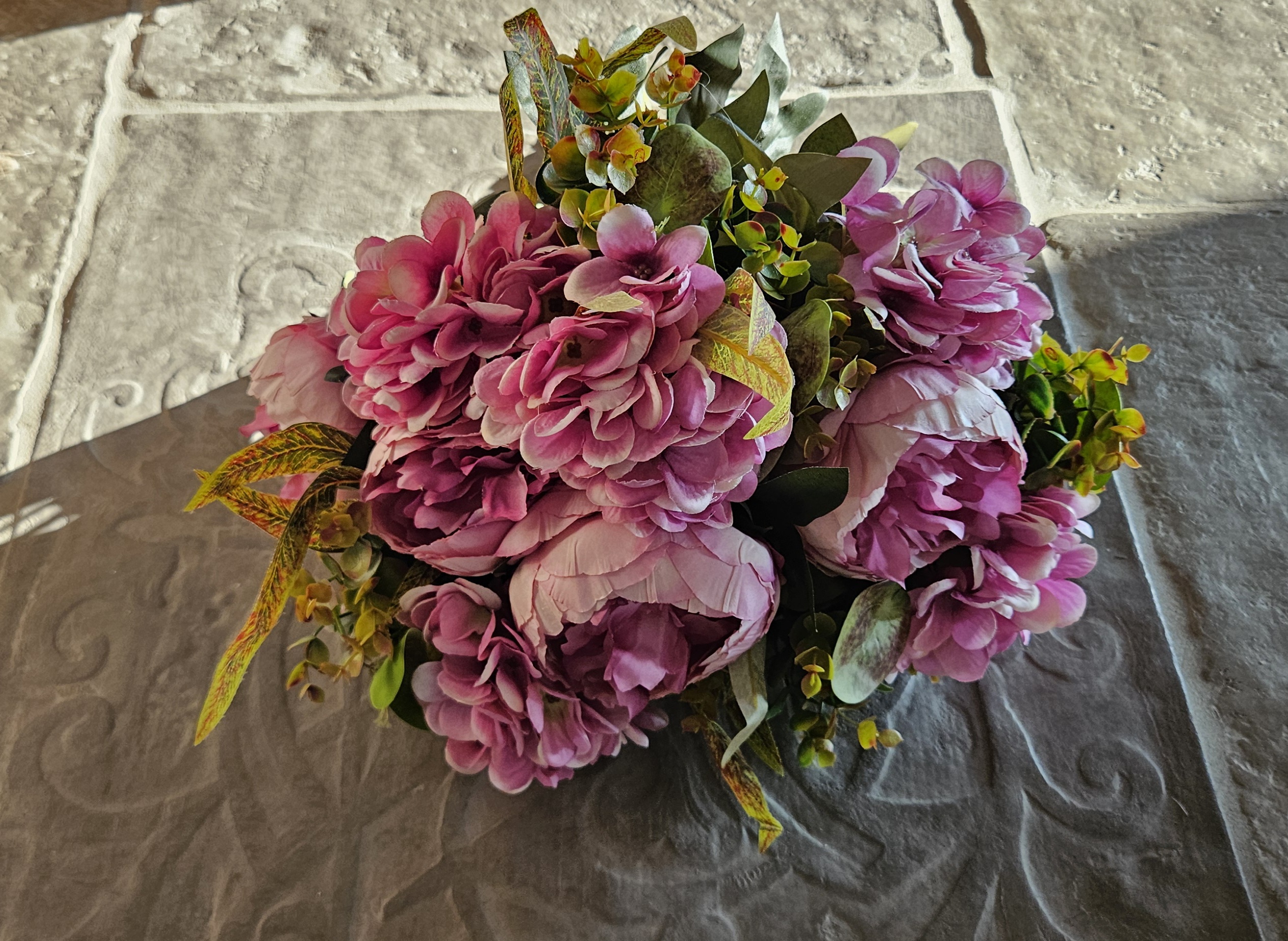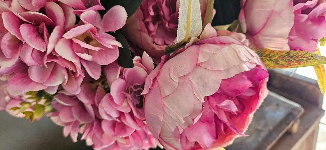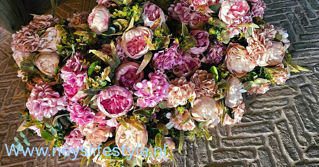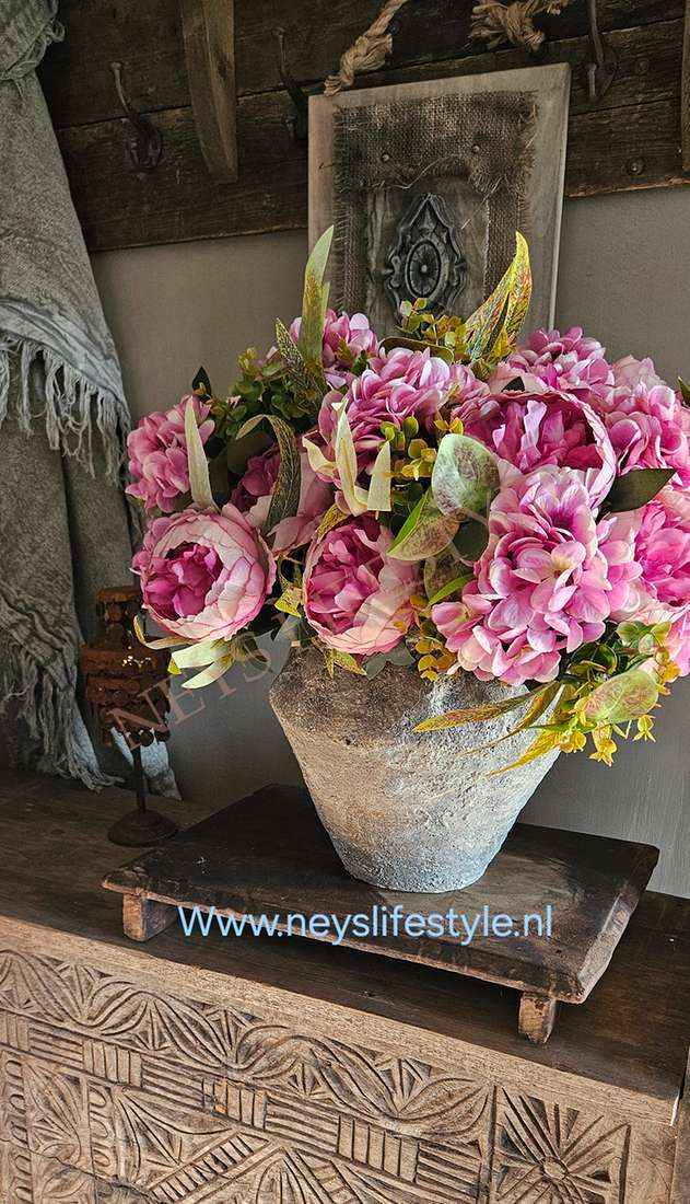 Mooi kant en klaar boeket van zijden paarse pioenrozen, hortensia's en wat groen blad erdoorheen. In de pot op foto 2 ziet u 3 bossen en op foto 1 ziet u 1 bos.