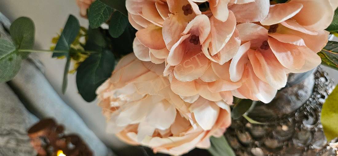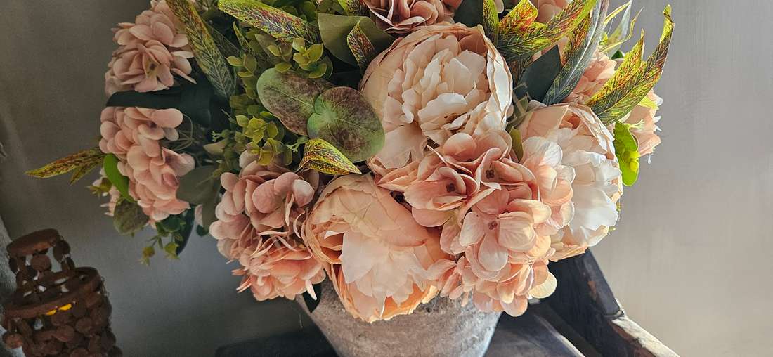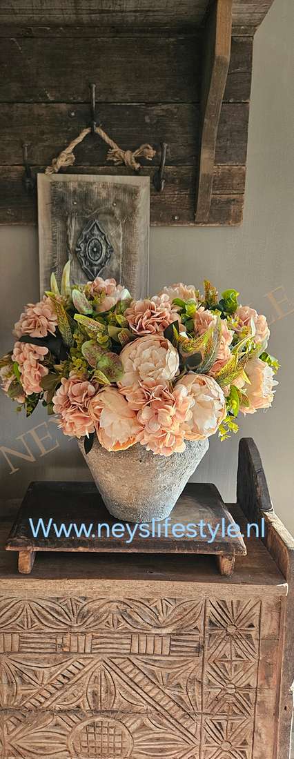 Mooi kant en klaar boeket van zijden zalm kleurige pioenrozen, hortensia's en wat groen blad (excl eucalyptus) erdoorheen. In de pot op foto 1 ziet u 1 bos en op foto 2 ziet u 3 bossen bloemen.