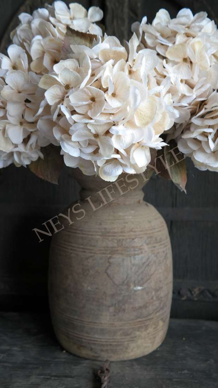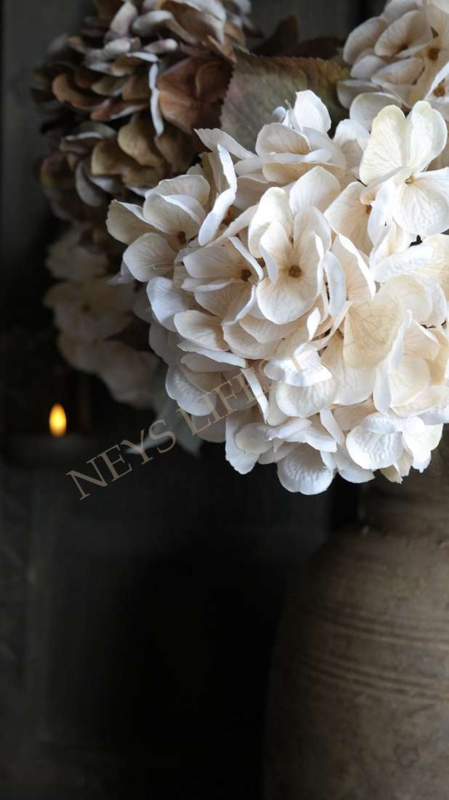 Zeer mooie zijden hortensia bloem in een warme beige kleur. Zet er een paar in een mooie pot en klaar ben je! Of combineer ze met de andere bloemen uit deze lijn!