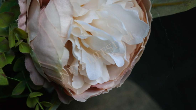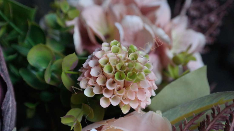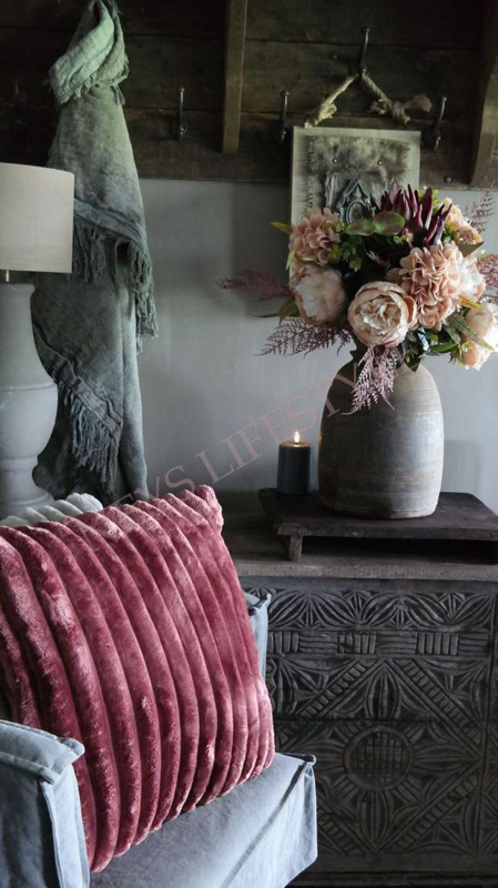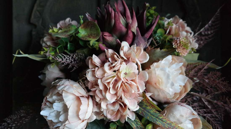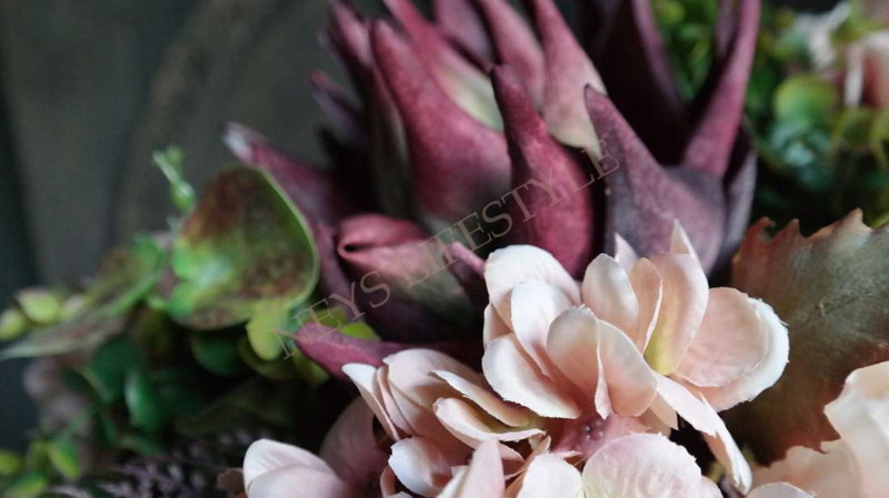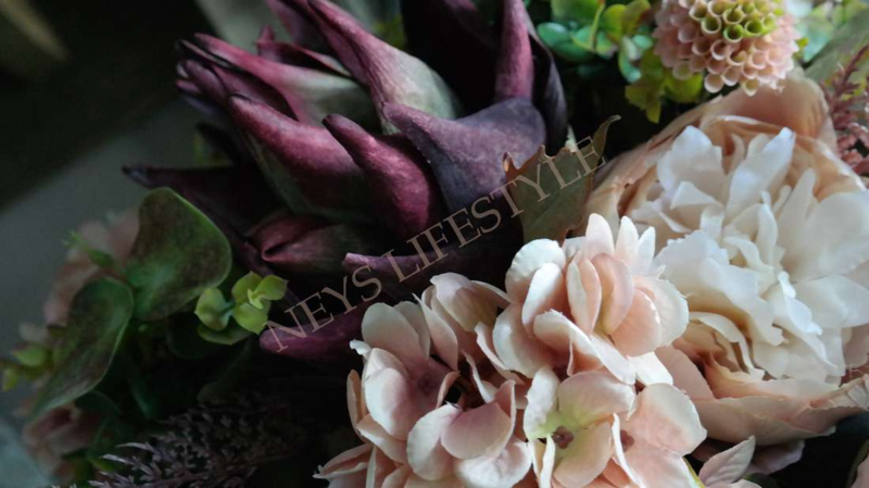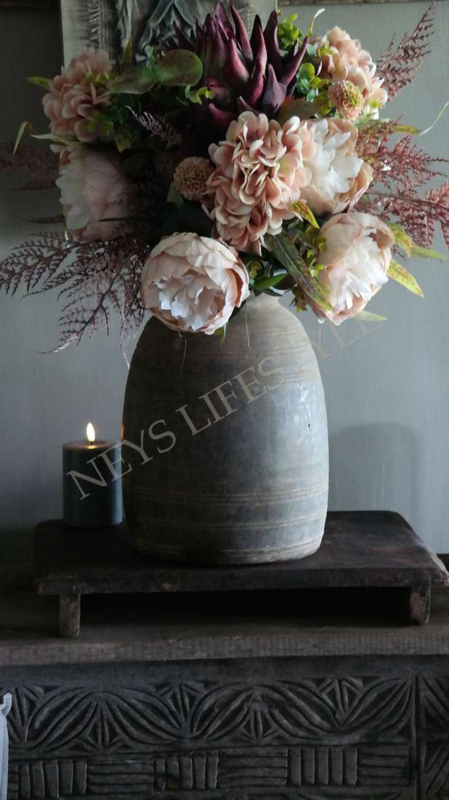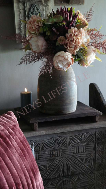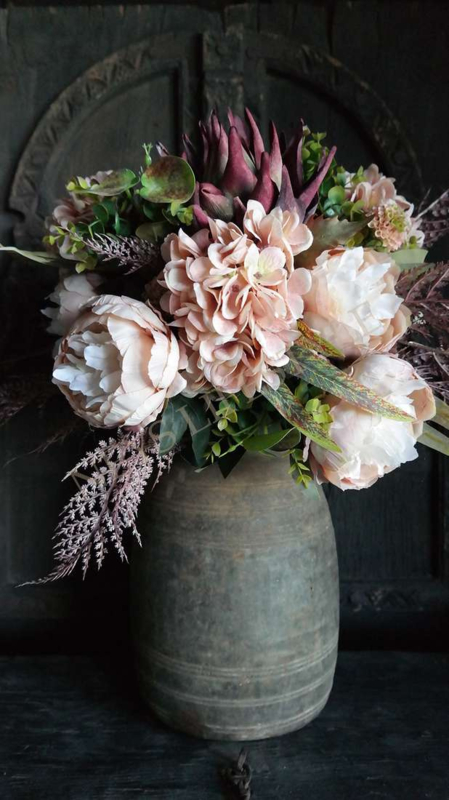 Prachtig najaars boeket in de warme kleuren bordeaux & zalm/roze. Het boeket wordt kant en klaar geleverd. Het zijden boeket bestaat uit zalm kleurige pioenrozen, hortensia's, groen blad, 1 grote artisjok, asparagus takken & kleine dahlia bloemen.