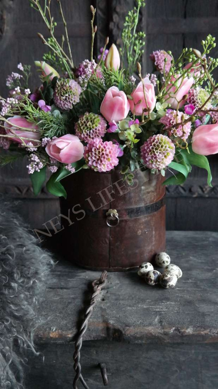 Stoere oude emmer van metaal in een roestkleur met een beschermlaag. Leuk om zijden bloemen, druifjes, nep plantje enz in te zetten of een oude lepels, pennen enz.