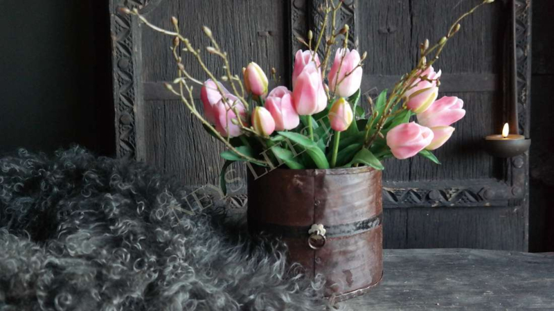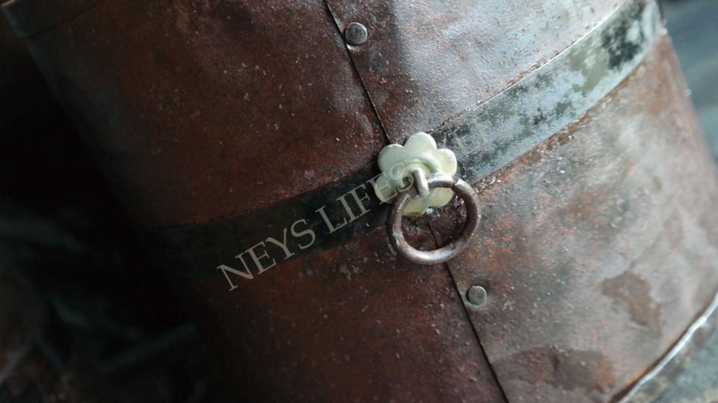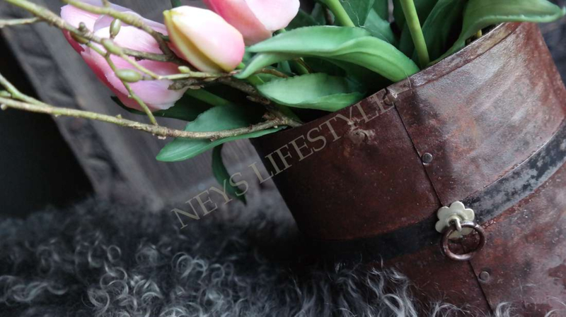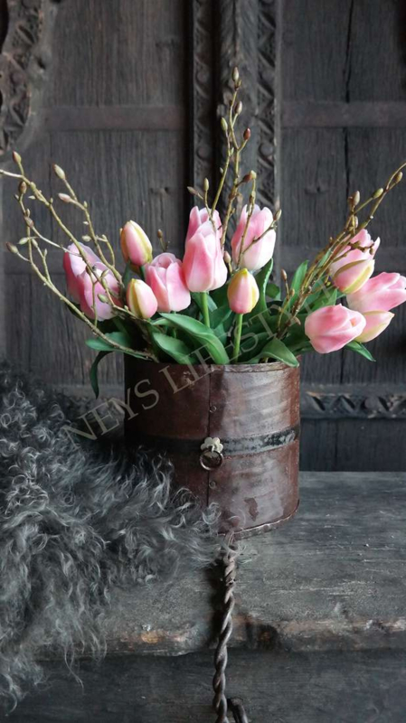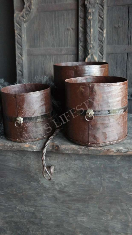 Stoere oude emmer van metaal in een roestkleur met een beschermlaag. Leuk om zijden bloemen, druifjes, nep plantje enz in te zetten of een oude lepels, pennen enz.