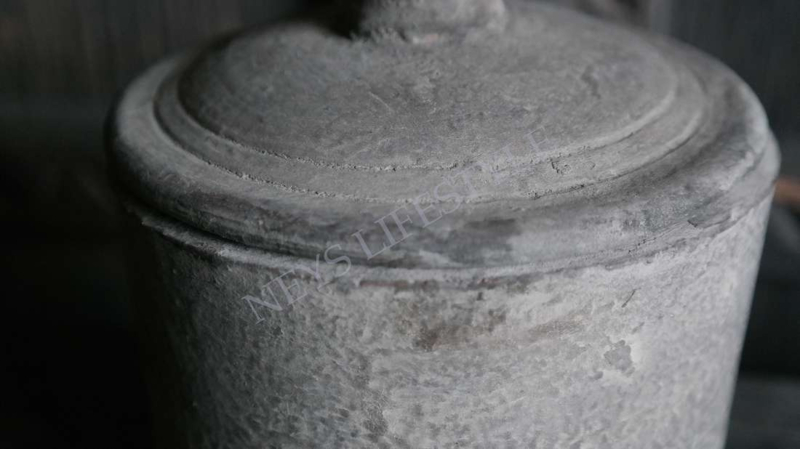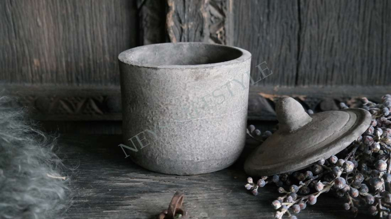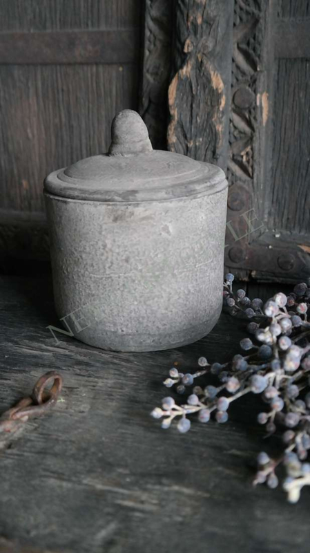 Stoere pot met deksel gemaakt van aardewerk in de warme beige/grijze kleur. Mooi ter decoratie maar ook om bijvoorbeeld in de keuken te gebruiken.
