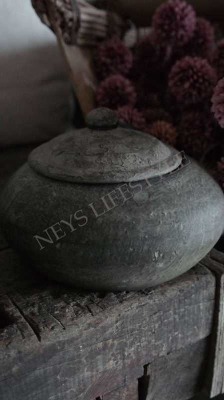 Prachtige verweerde pot met deksel gemaakt van aardewerk in de warme beige/grijze kleur. Mooi ter decoratie maar ook om bijvoorbeeld in de keuken te gebruiken.