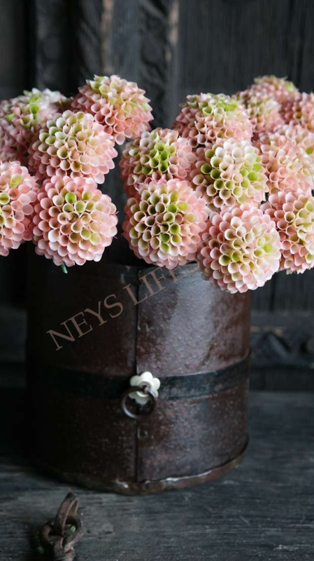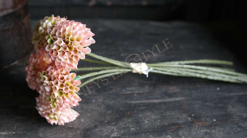 Sfeervol bosje kunst dahlia bloemen in de prachtige warme roze/zalm kleur met een beetje fris groen erdoorheen.