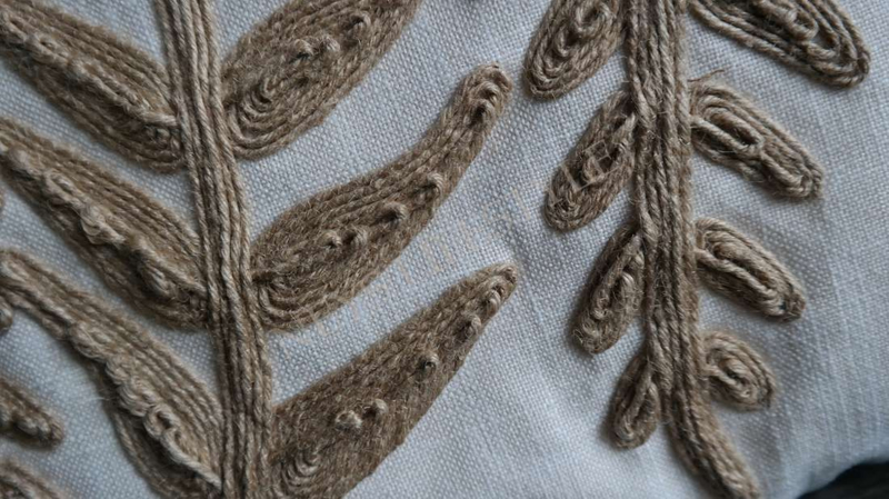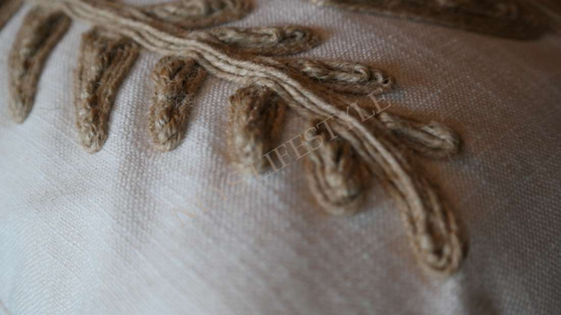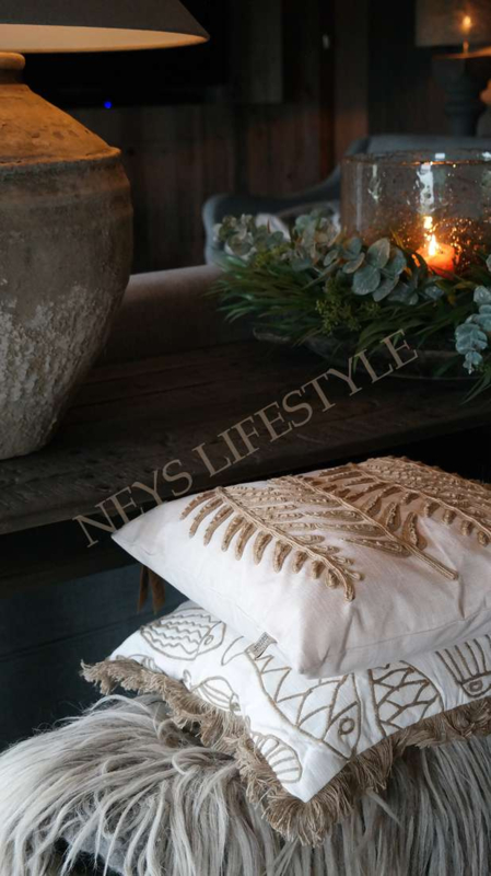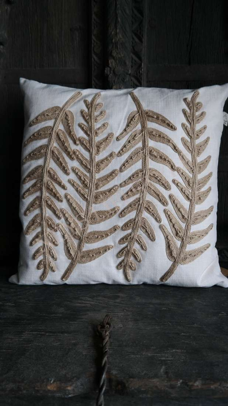 Luxe kussen in een linnen stof met de afbeelding van bladeren erop genaaid van jute draad in 3D. De achterzijde is niet bedekt met de print. Combineer het kussen met de andere kussens uit deze lijn. Mooi op de bank, fauteuil, loungesetof op bed bijvoorbeeld. Er zit een rits in.
