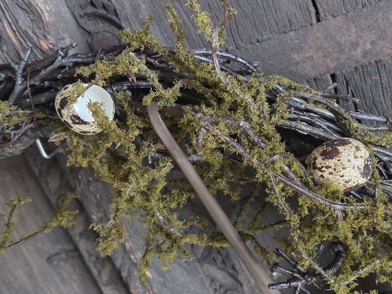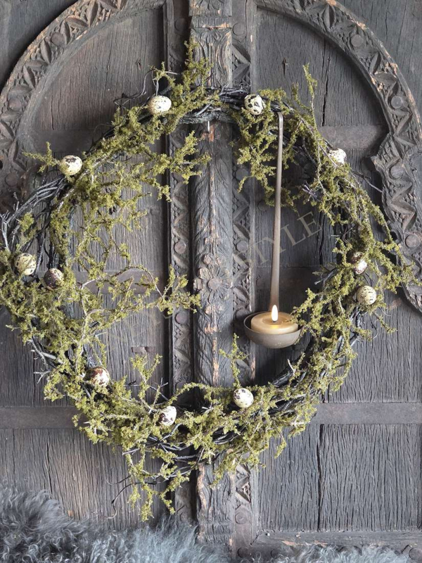 Stoere krans van wilde namaak takken met een laagje namaak mos. Mooie basis krans om verder te decoreren met bijvoorbeeld kwartel eitjes of andere takken.