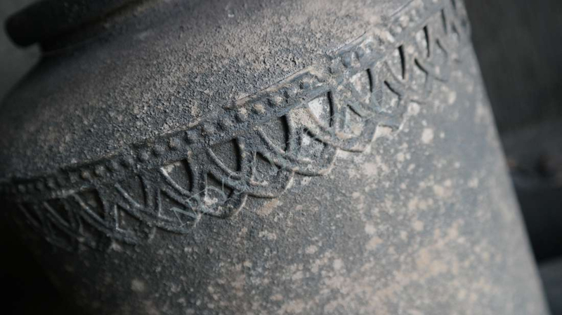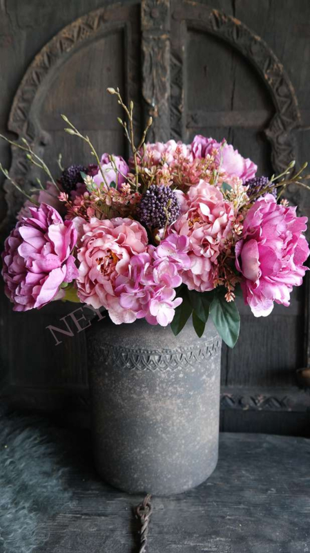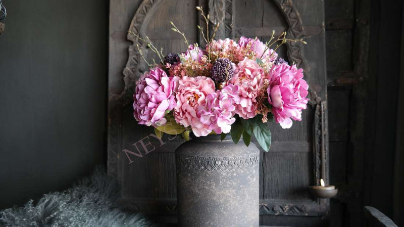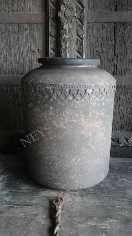 Landelijke vaas van metaal in een mooie verweerde kleuren bruin en een sierlijke rand aan de bovenzijde.