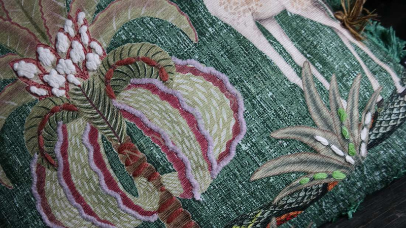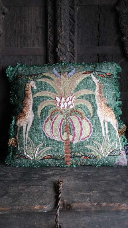 Mooi donkergroen kussen van luxe stof met leuke details als franjes, verdikte stof enz om de afbeeldingen wat meer te benadrukken. Aan de zijkant zitten groene franjes en de achterzijde is niet bedrukt. Er zit een rits in.