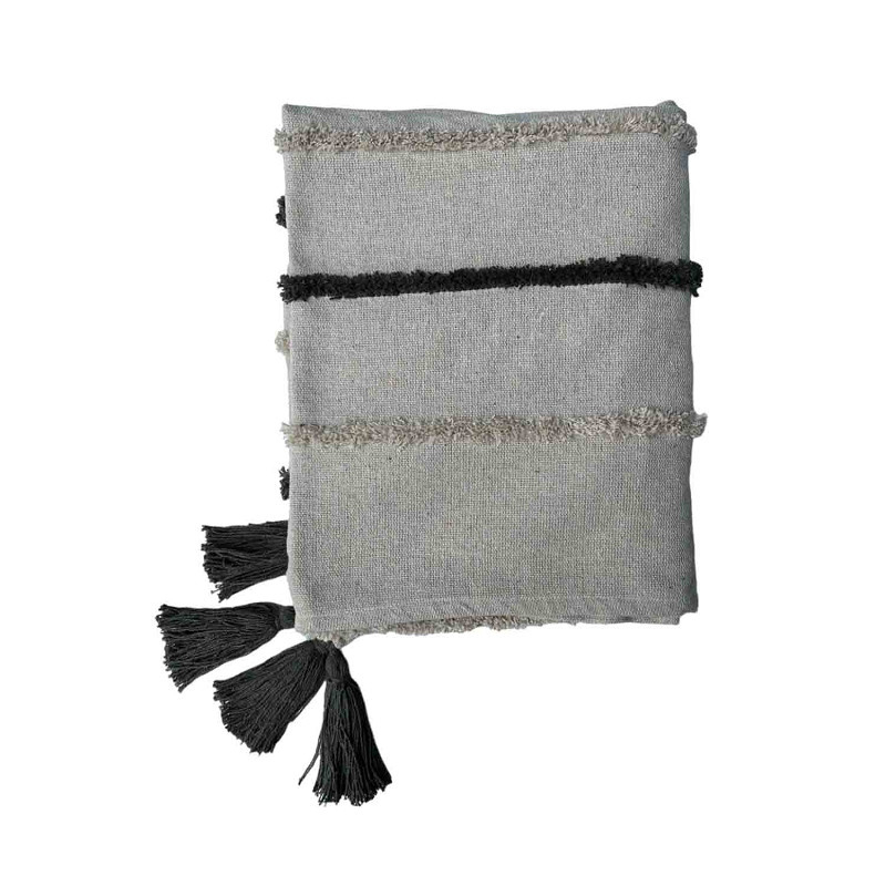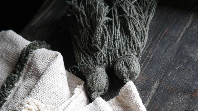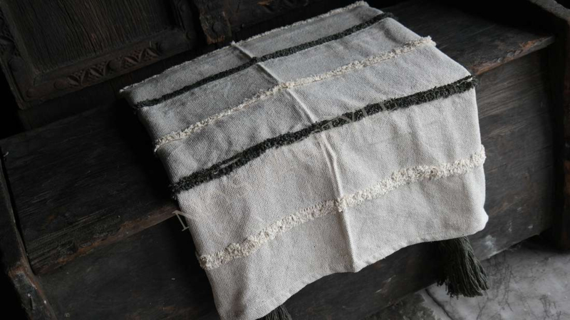 Mooi landelijk plaid van 100% katoen in de warme zand kleur met beige en groene strepen en donkergroene franjes aan de onderzijde. Mooi voor op de bank, fauteuil of ter decoratie aan een kapstok of ladder bijvoorbeeld.