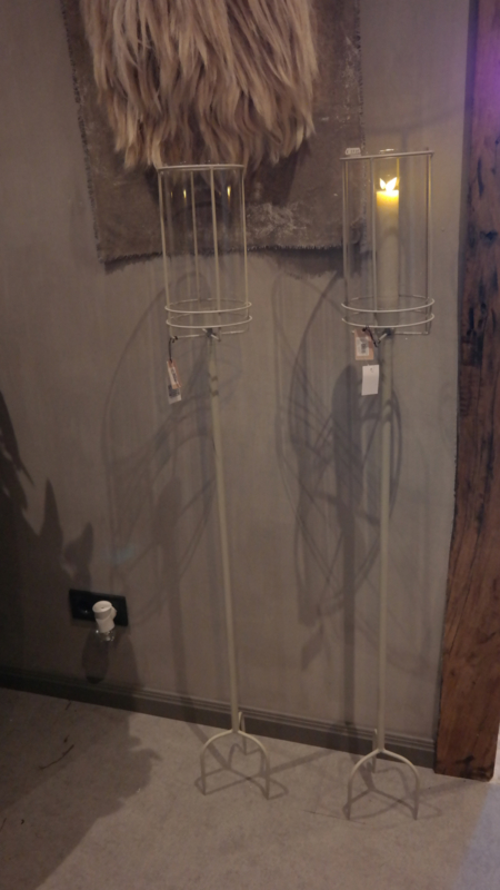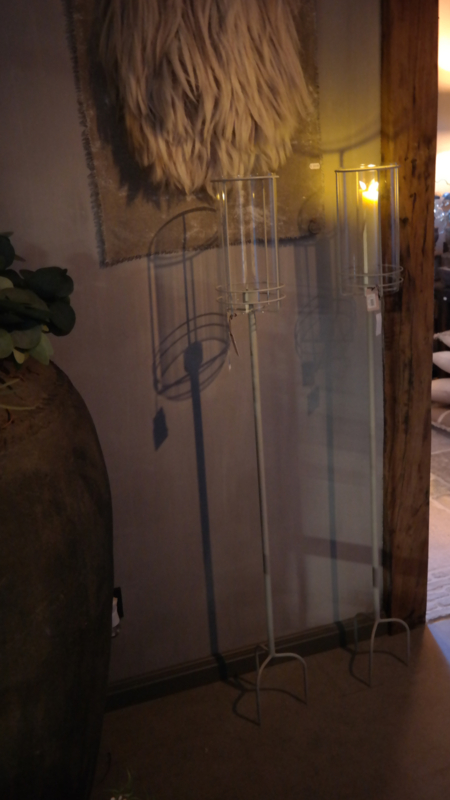 Stoere créme kleurige kaarsenkandelaar van metaal met glazen windlicht om een XL LED dinerkaars in te branden. Met de steker kun je ze in de grond zetten.