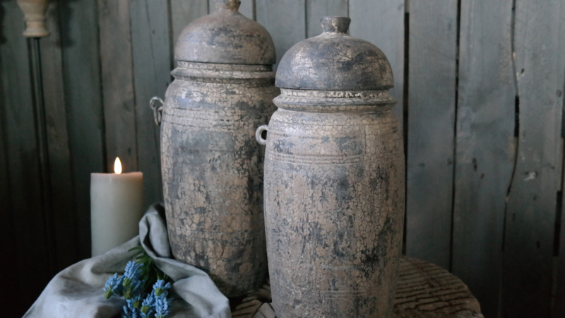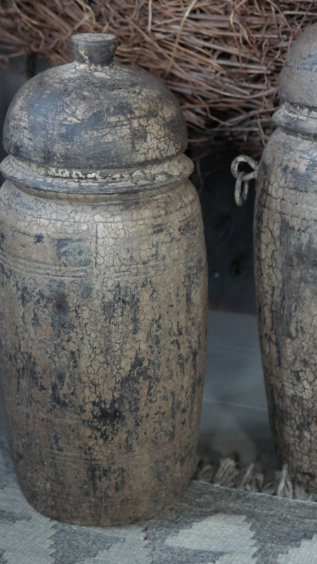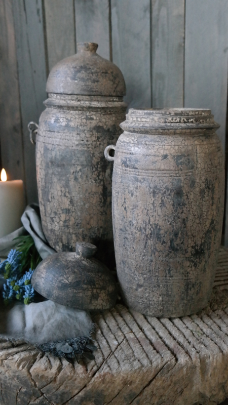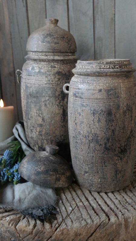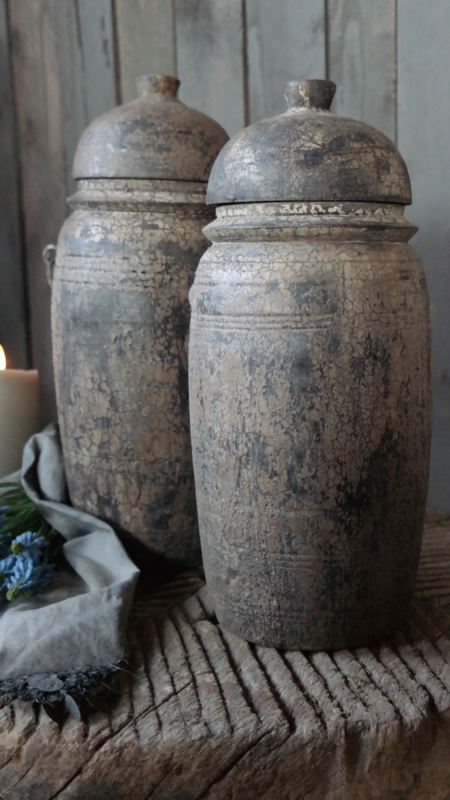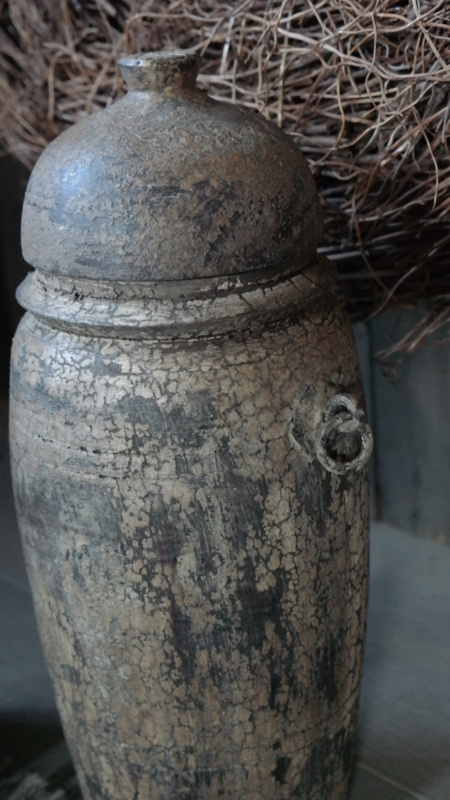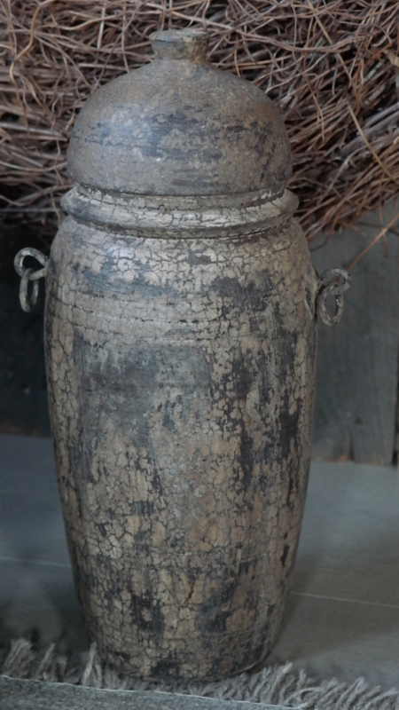 Stoere houten pot met deksel en een mooie verweerde bewerking in de kleuren bruin/donkergrijs.