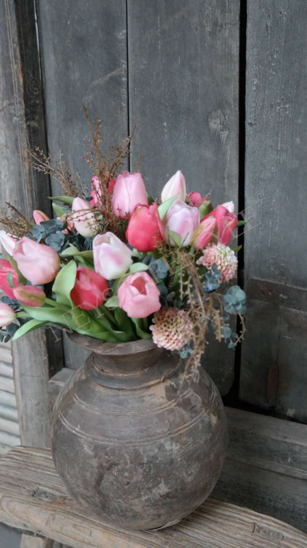 Niet van echte tulpen te onderscheiden! Prachtig kant en klaar boeket met bosjes real touch tulpen (28 cm l) in diversen kleuren roze met wat namaak eucalyptus & kunst takken.