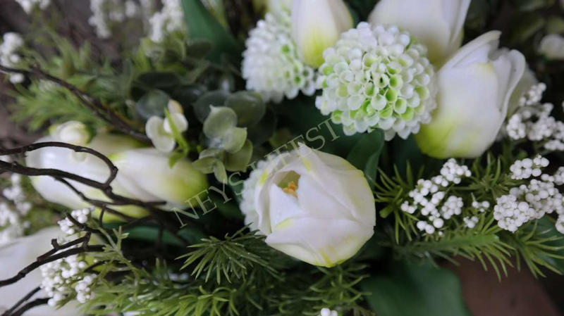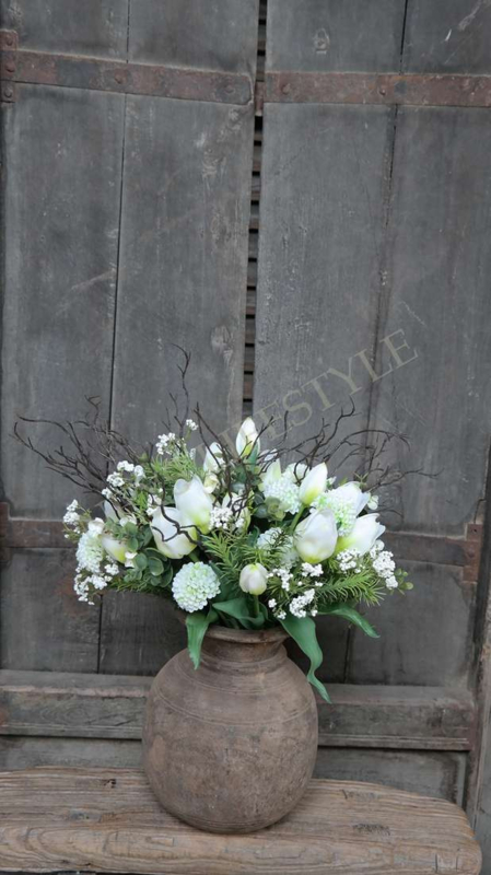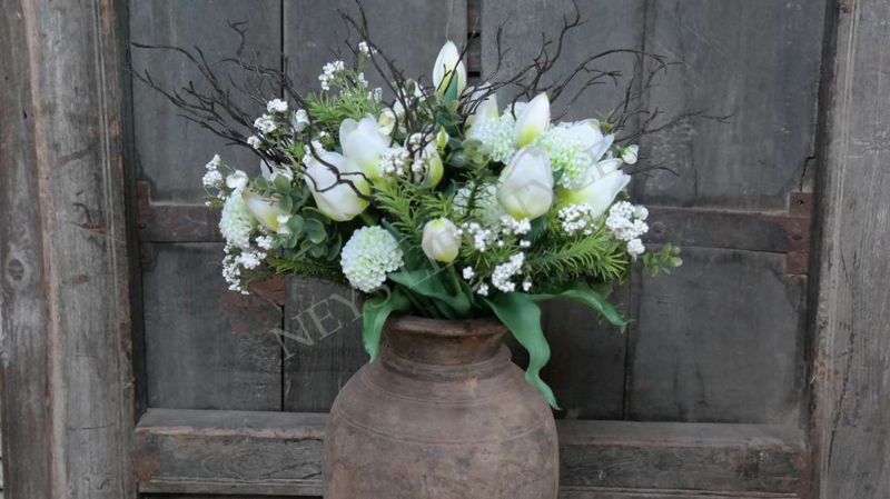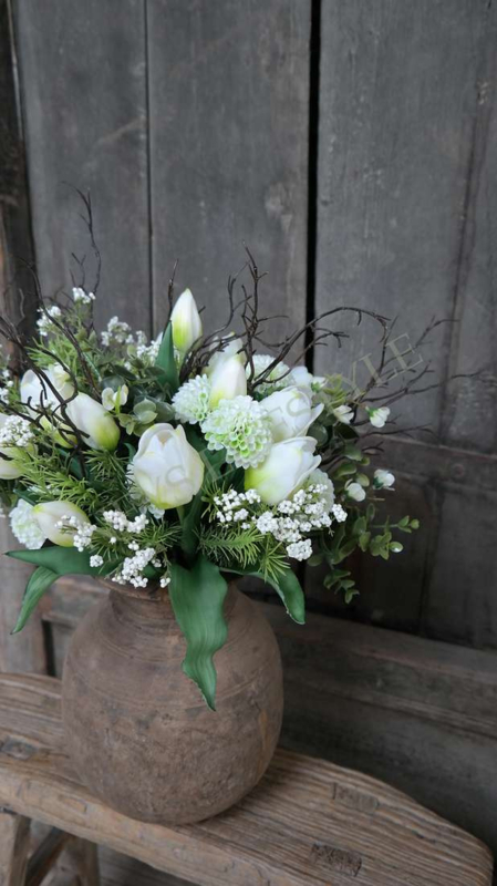 Niet van echte tulpen te onderscheiden! Prachtig kant en klaar boeket met bosjes real touch tulpen (28 cm l) in een kleur wit met bosjes dahlia mix & kunst takken.