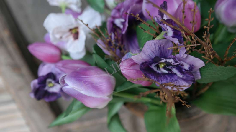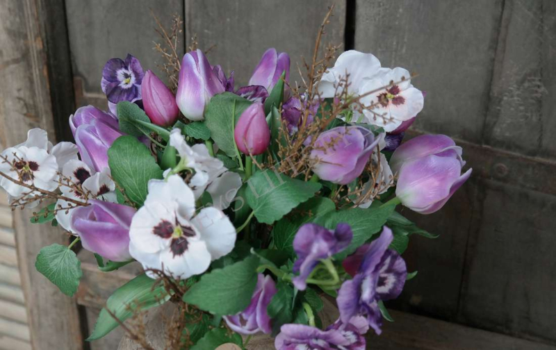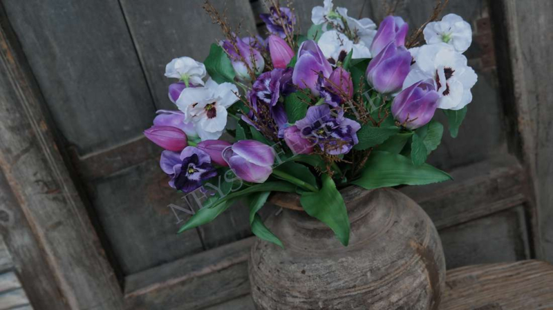 Niet van echte tulpen te onderscheiden! Prachtig kant en klaar boeket met bosjes real touch tulpen (28 cm l) in een paarse kleur en zijden viooltjes in een witte & paarse kleur.