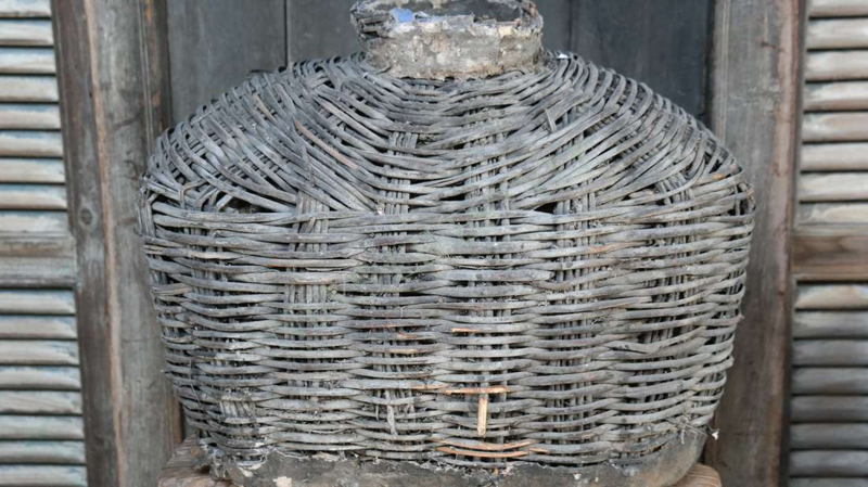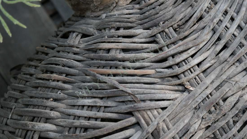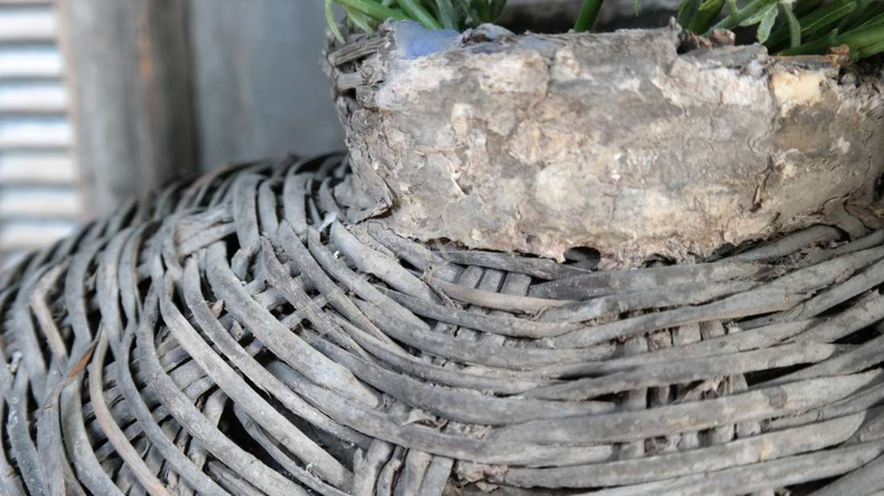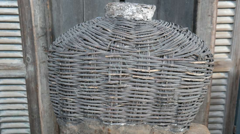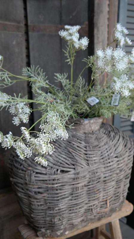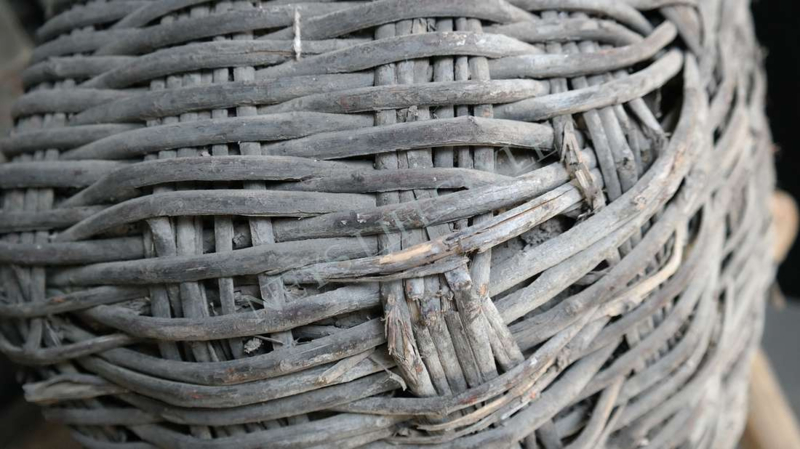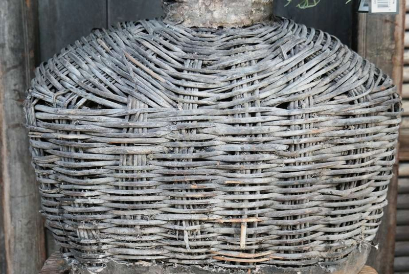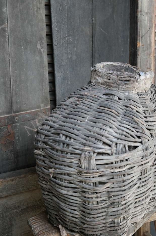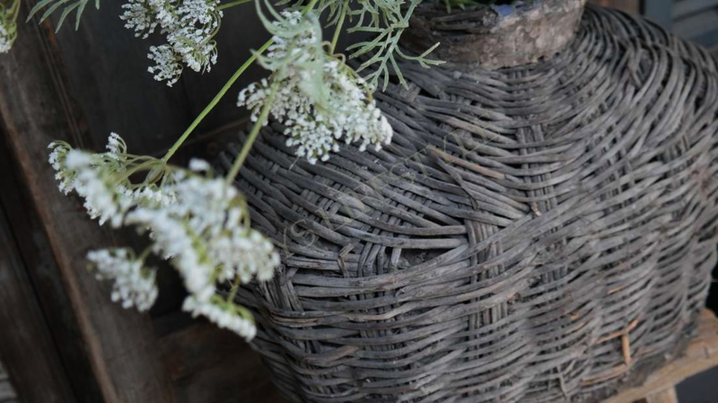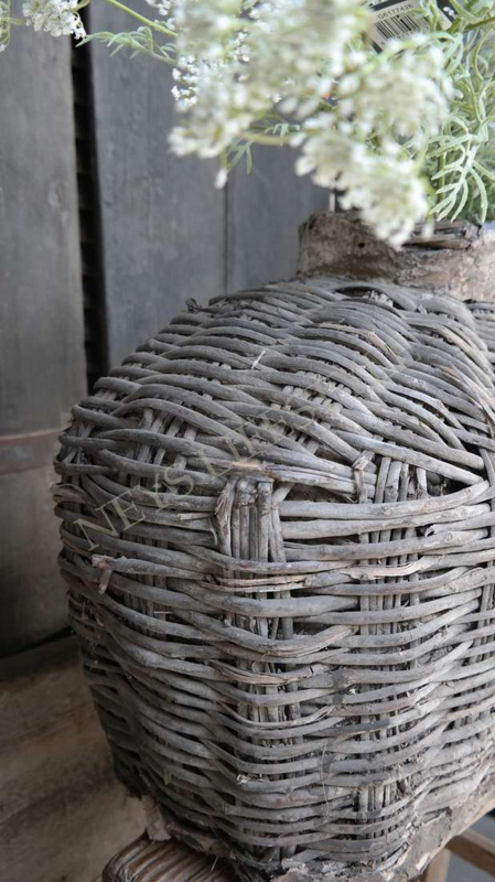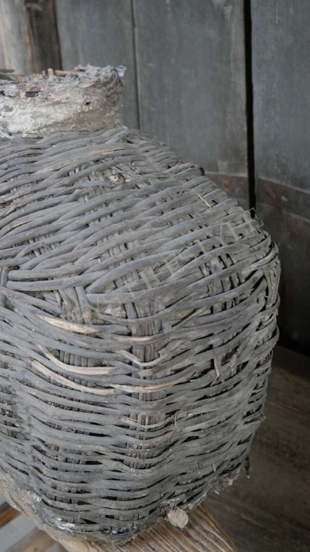Mooie unieke & oude rieten leemmand in de warme kleur verweerd grijs/bruin. Hij is al prachtig van zichzelf met een shabby doek of dadeltak bijvorbeeld maar je kunt er ook een mooi zijden boeket in zetten als pronkstuk in je woning.