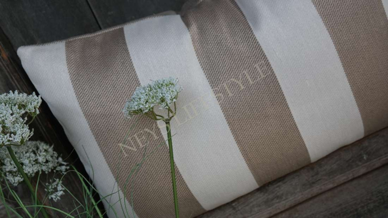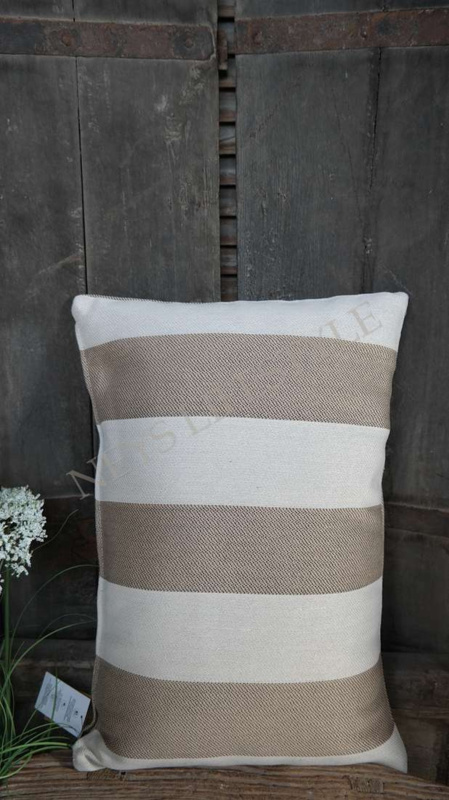 Mooie landelijk buiten kussen met een streep patroon in de kleuren taupe-wit. De achterzijde is niet bedekt met het patroon en heeft 1 kleur zie foto 8. Combineer het kussen met de andere outdoor kussens uit deze lijn. Mooi op het loungeset, tuinstoel/bank maar ook voor binnen uiteraard.