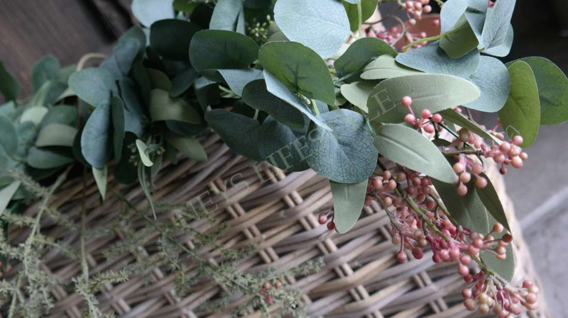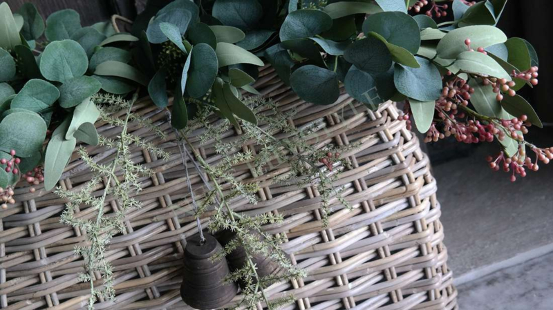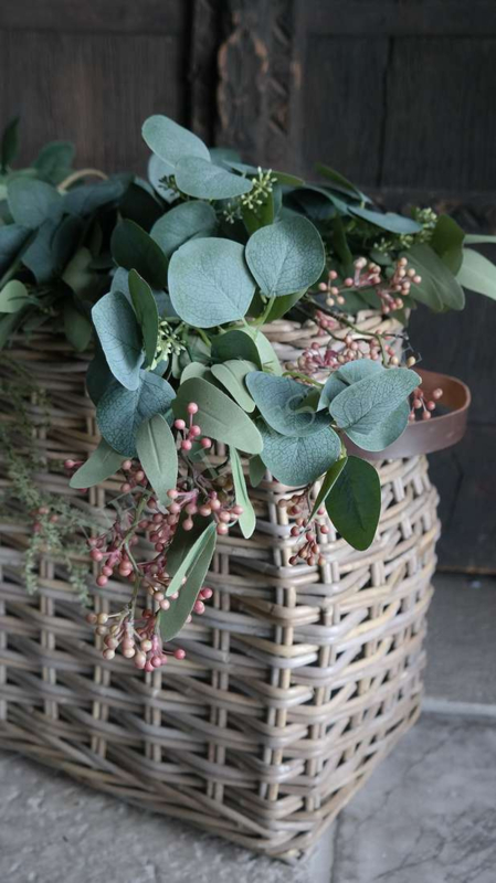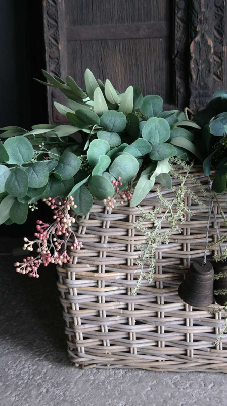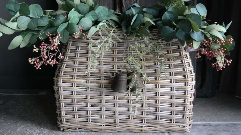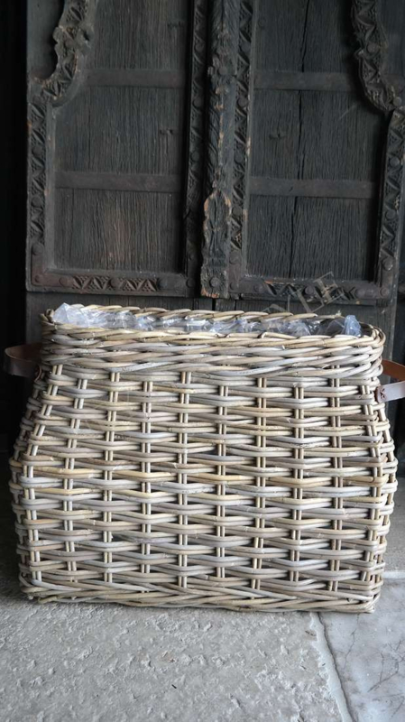 Grote stoere plantenbak van het grove gevlochten rotan. Het leren hengsel aan de zijkant geeft de mand een stoer uiterlijk. De mand loopt vanaf de onderkant schuin naar boven toe.