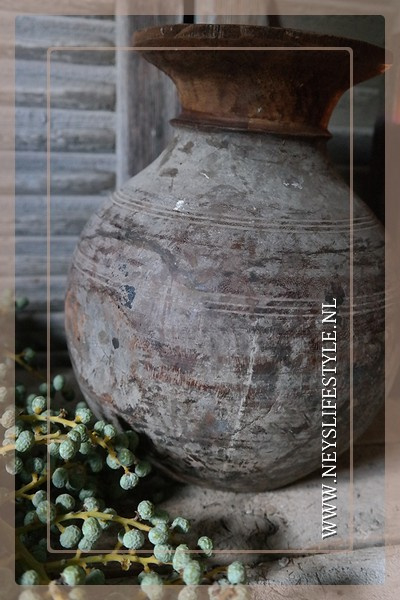 Mooie oude Nepalese kruik met een ronde vorm en een verweerder bruin/grijze kleur.