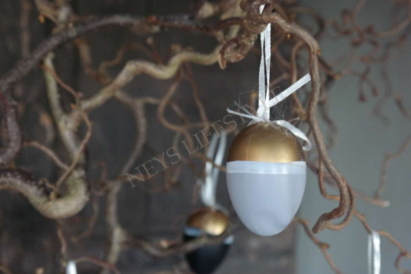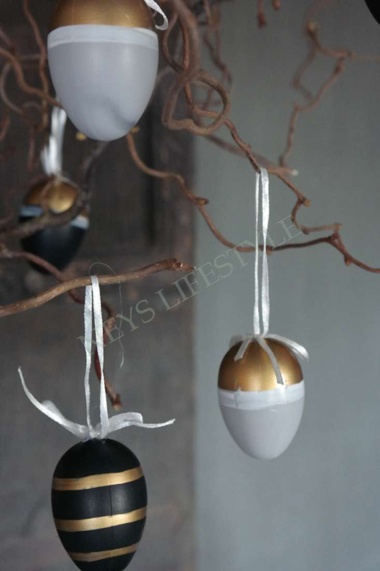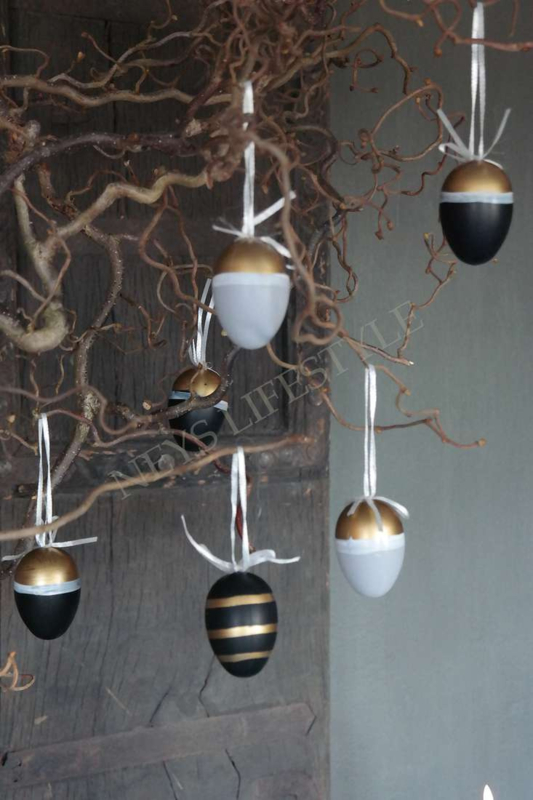 Zakje met 6 kunststof hangeieren met lint en strik in de kleuren zwart, goud en grijs met diversen soorten bewerkingen. Leuk om in de Paastakken te hangen!