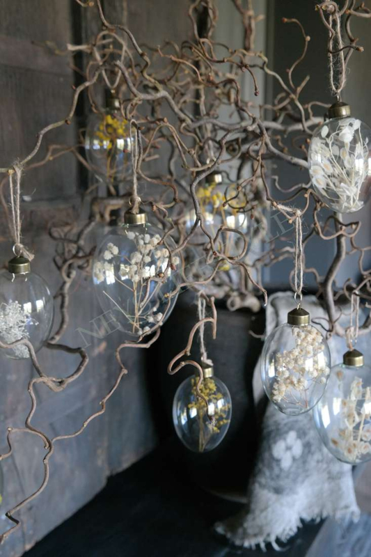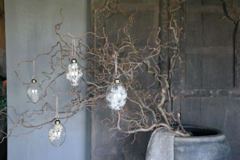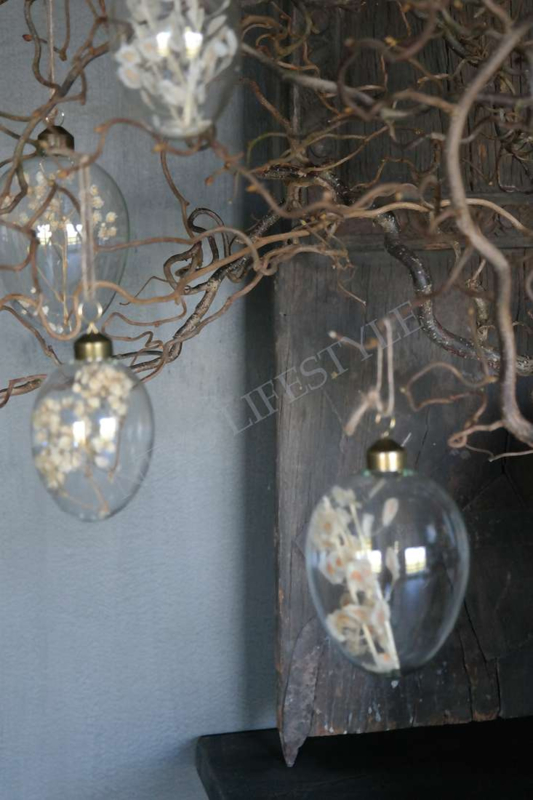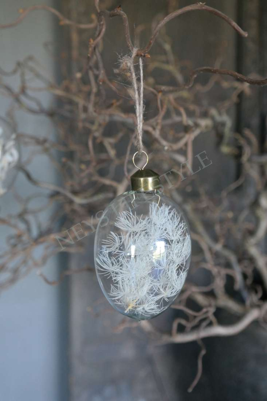 Geweldig leuke set van 4 grote glazen eieren met verschillende soorten droogbloemen erin in de kleur wit/beige. Leuk in combinatie met de kleine of middelste variant en de eieren met gele droogbloemen!