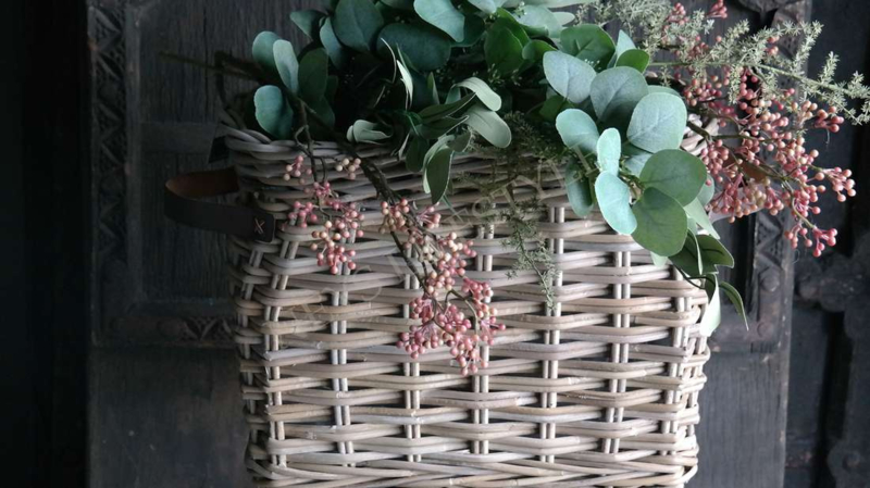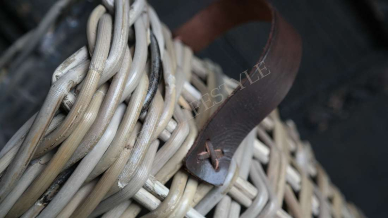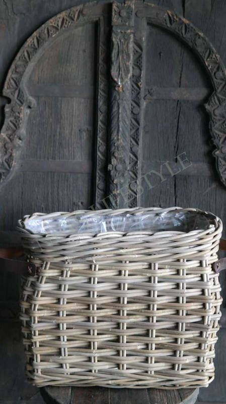 Stoere plantenbak van gevlochten rotan met bruin leren hengsels. De mand loopt vanaf de onderkant schuin naar boven toe.