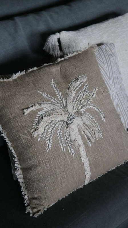 Luxe linnen kussen met een palmboom die verdikt is in een créme kleur stof en frankjes aan de zijkanten. De achterzijde is niet bedekt. Leuk in combinatie met de stipe kussens bijvoorbeeld.