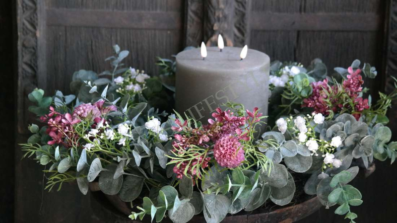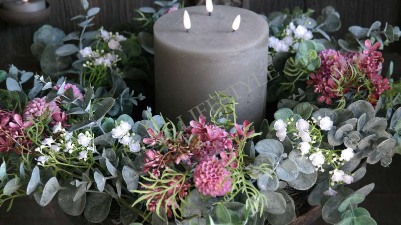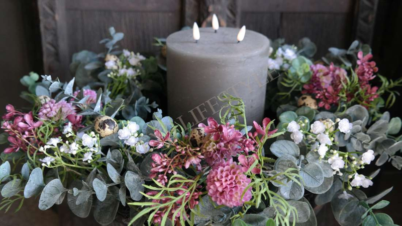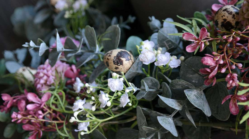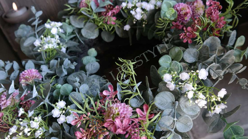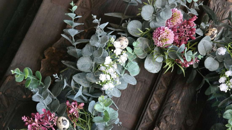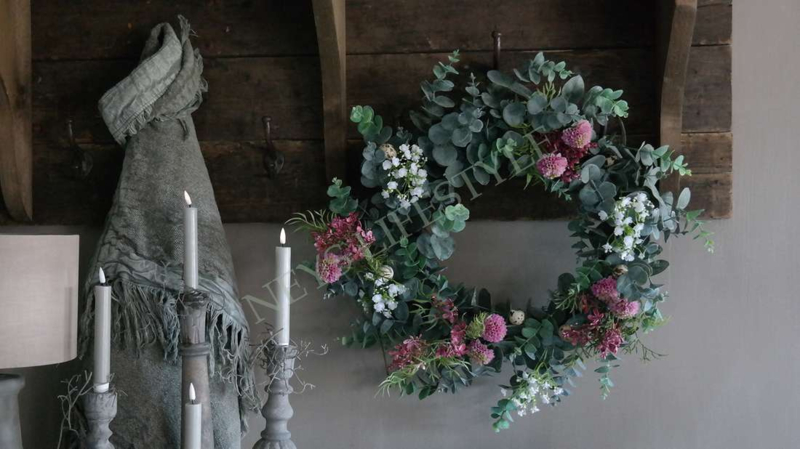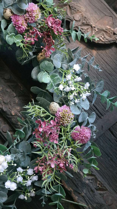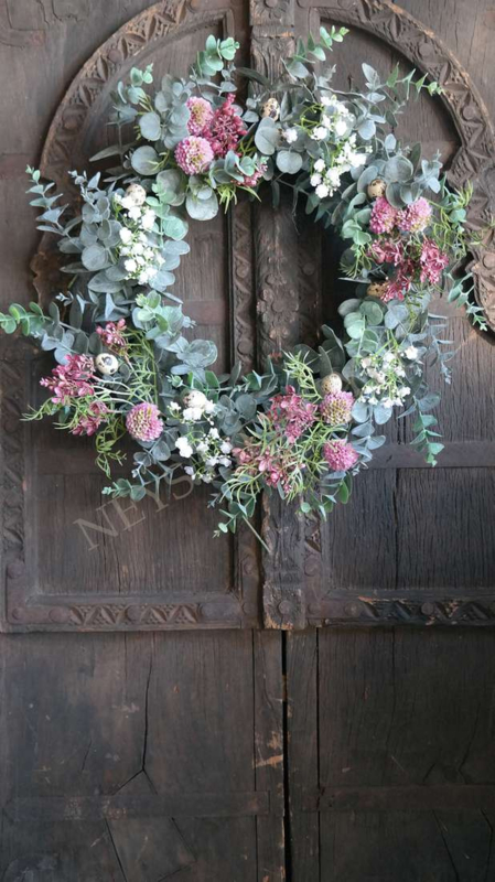 Prachtige grote opgemaakte kunst eucalyptus krans met zijden bloemen & exclusief kwarteleitjes. Bijna niet van echt te onderscheiden. Mooi op een dienblad met een windlicht/LED kaars in het midden of aan de wand, kasptok, ladder enz.
